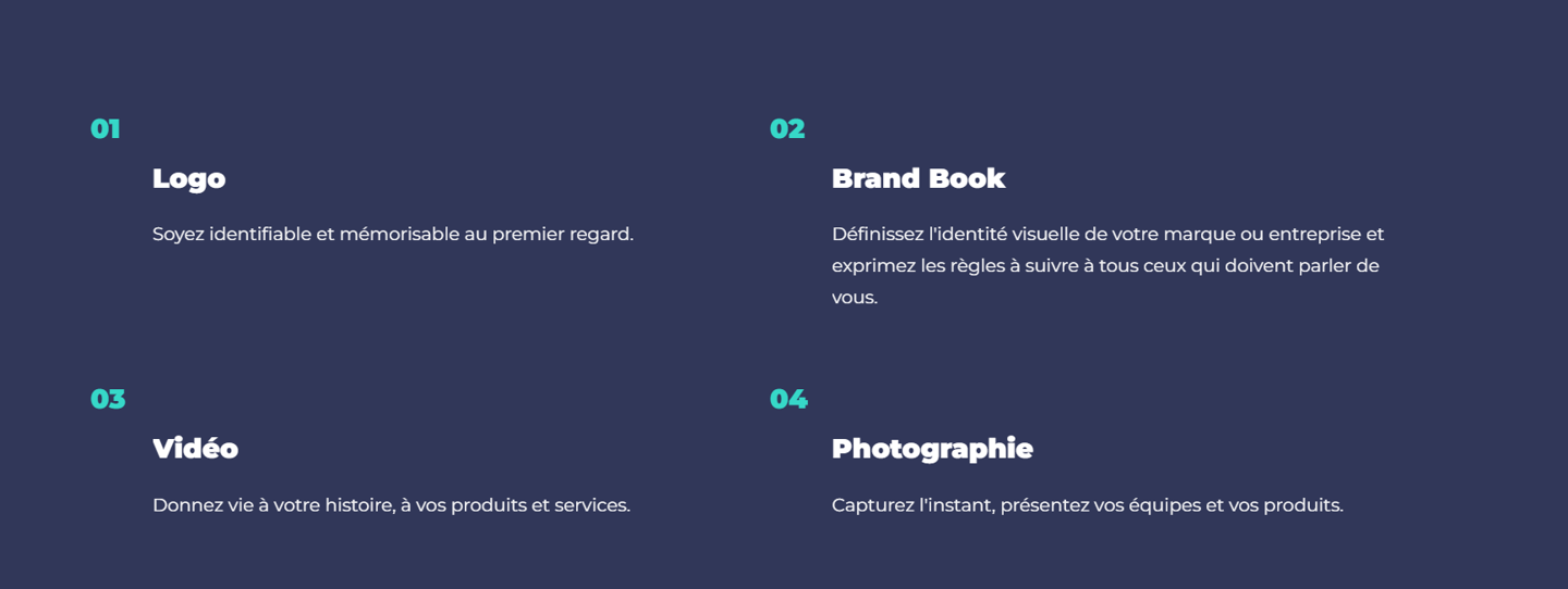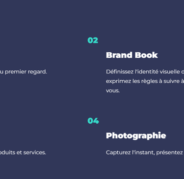 Nouvelle marque, nouveau concept, rafraîchissement, besoin de mettre en images : Vos besoins évoluent avec le temps. Vous devez coller aux attentes de votre marché tout comme aux valeurs de votre entreprise qui changent naturellement. Voici les différents types de prestations créatives que nous pouvons réaliser pour vous :